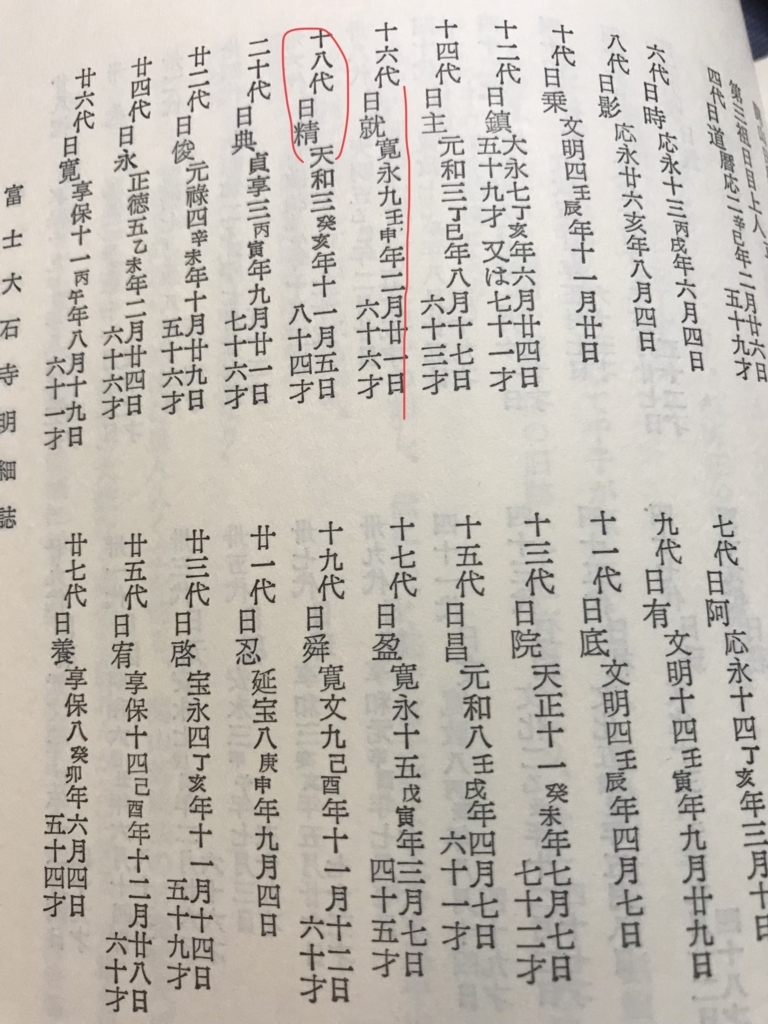 つまり日就から日精に相承があったとする客観的な資料が存在せず、日精が相承を受けたとする自己申告の日付も日就の死後になっているのです。ですから上記の『富士大石寺明細誌』でも日精は「十八代」とされています。画像を見て確認ください。
