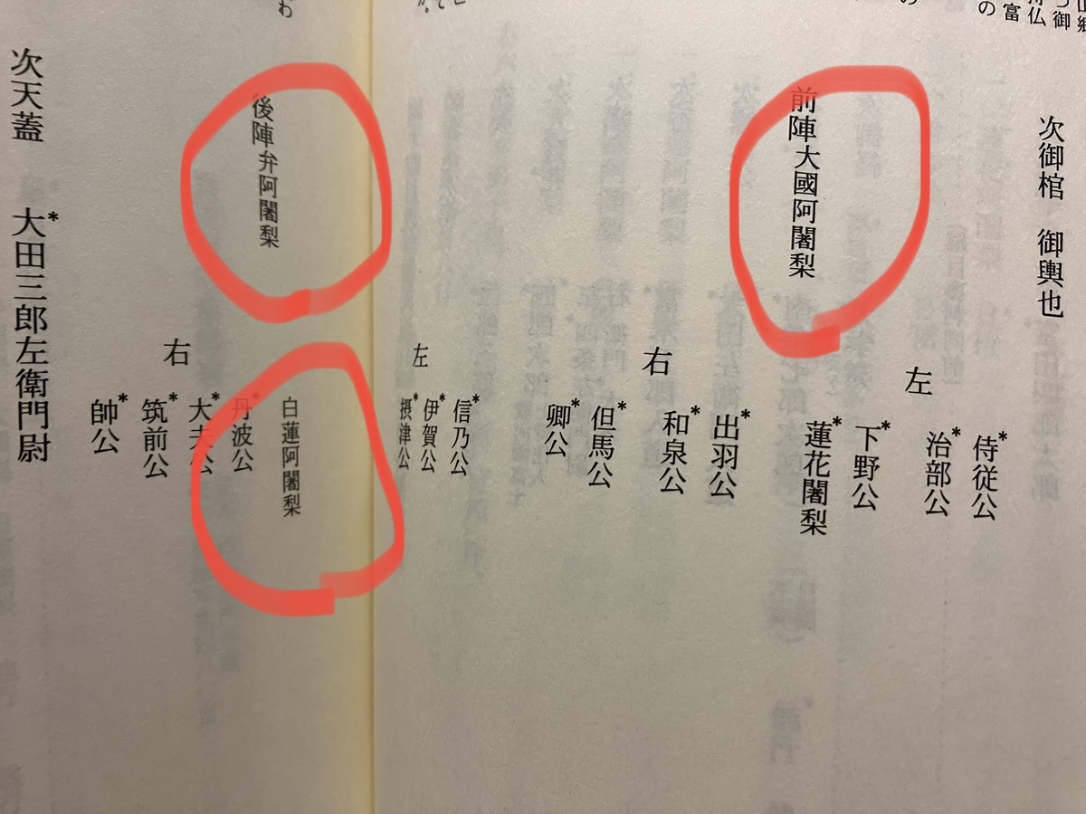 葬儀の前列は在家信者の先火や幟が立ち、その後に日蓮の棺が続きます。棺を囲んで前陣と後陣にそれぞれ分かれており、前陣の中心が「大国阿闍梨」日朗、後陣の中心は「弁阿闍梨」日昭が勤めています。それに対して「白蓮阿闍梨」日興は後陣の日昭の左の4番目に控えているのです(以下の画像参照。『日興上人全集』114〜115ページ)。