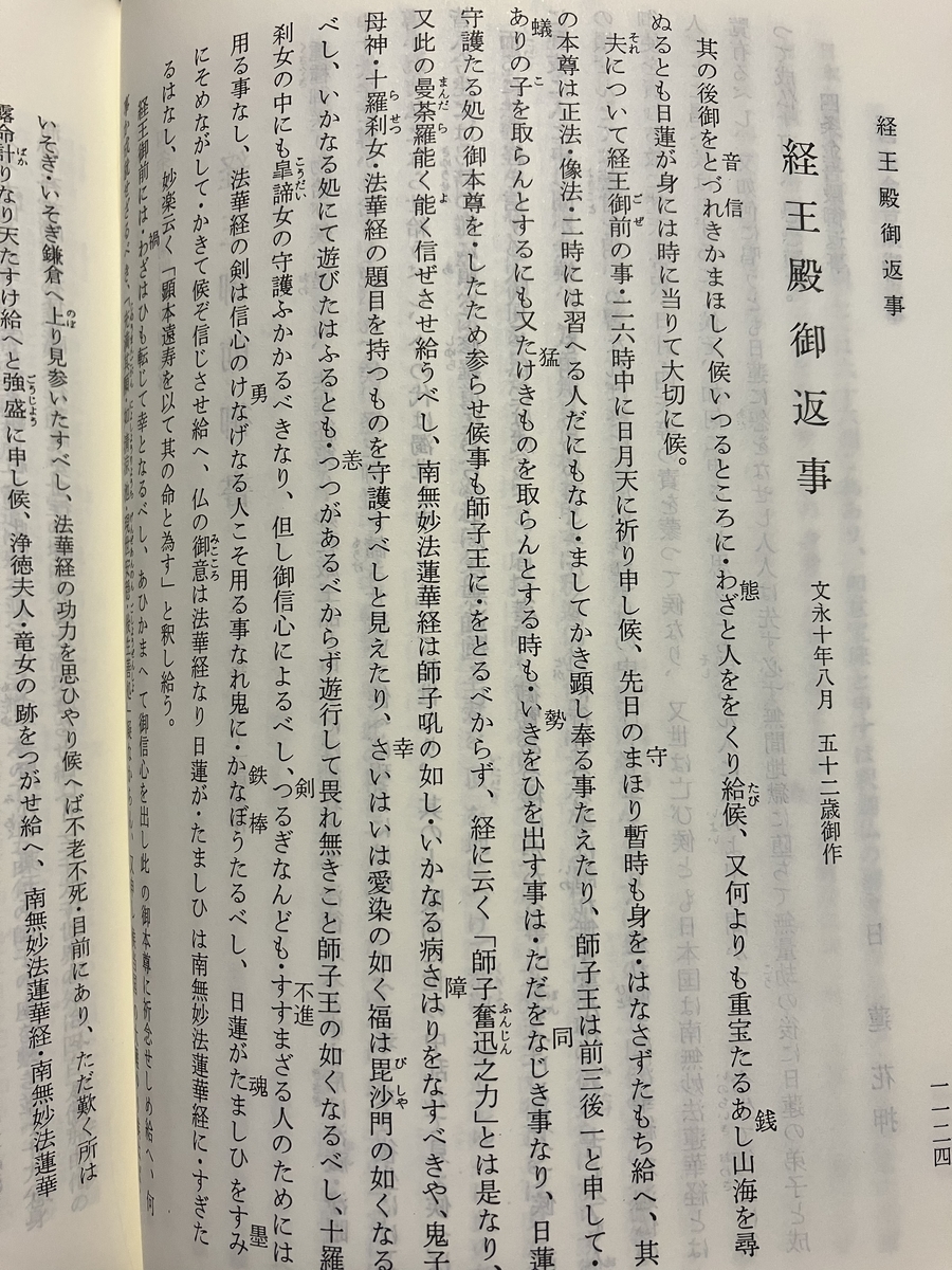 この『経王殿御返事』は、創価学会信徒や大石寺の法華講信徒さんには馴染みの深い御書として知られています。四条金吾頼基の娘とされる経王が病気になり、「南無妙法蓮華経は師子吼の如し・いかなる病さはりをなすべきや」と励ます部分はとても有名です。