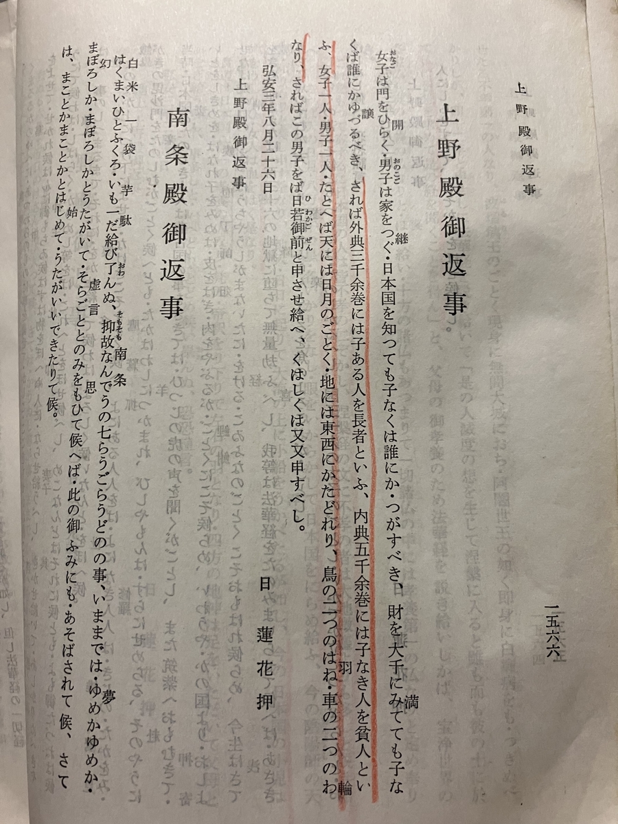「内典五千余巻には子なき人を貧人といふ、女子一人・男子一人・たとへば天には日月のごとく・地には東西にかたどれり」