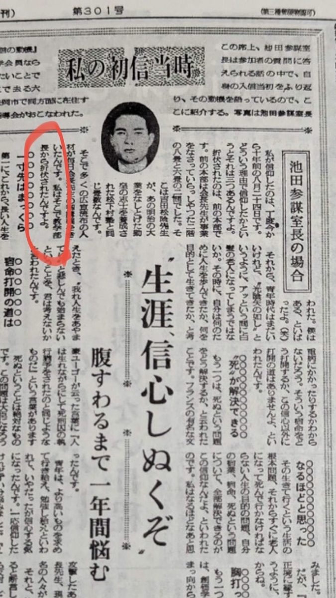 この6面左上の池田大作参謀室長の「私の初信当時」の記事を拡大したものを以下に載せてみます。