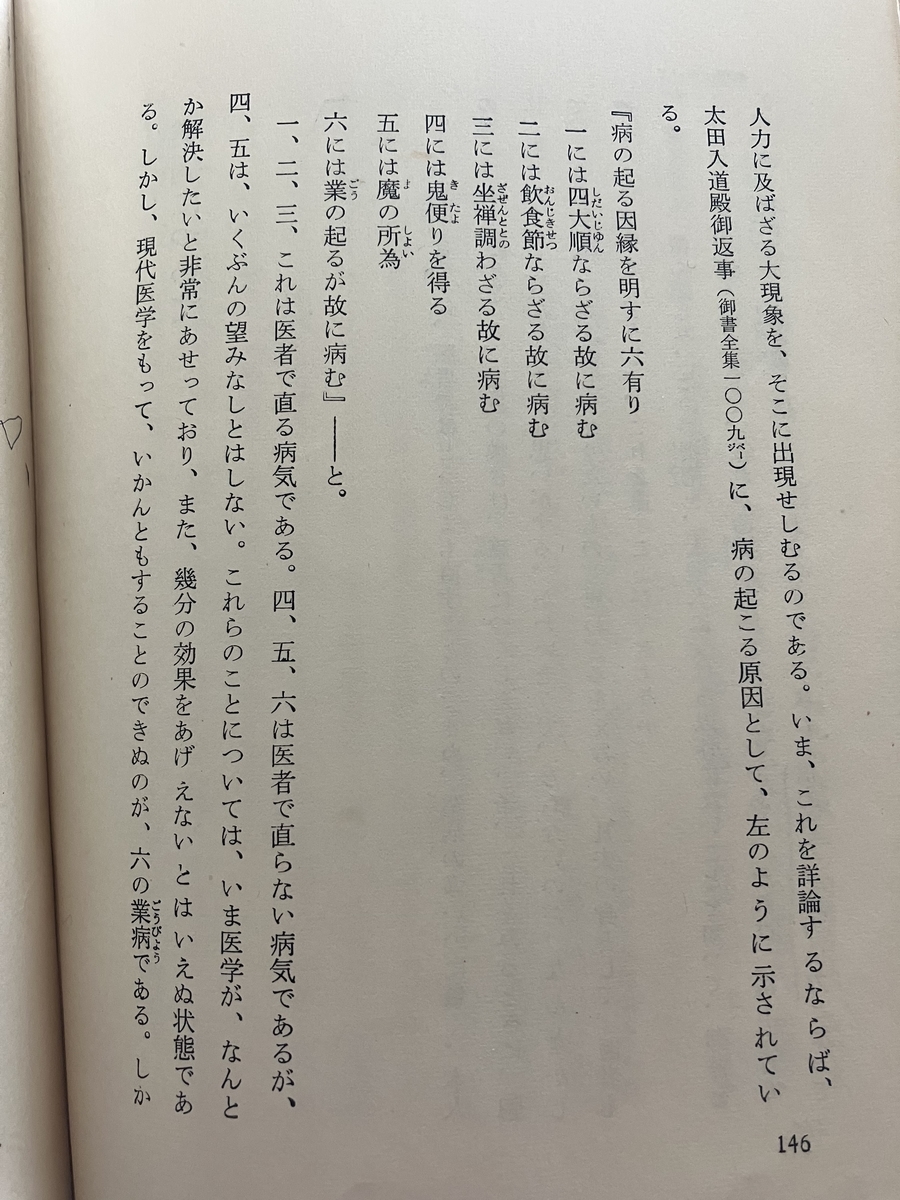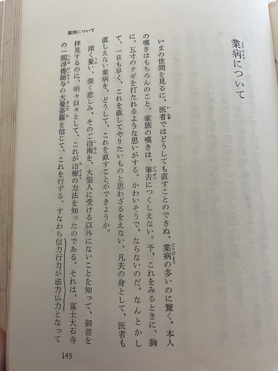 読んでおわかりかと思いますが、戸田城聖氏は過去世の業因によって起こる難病を小児麻痺、精神病、脳水症としています。そしてその原因を日蓮の『太田入道殿御返事』(真蹟断簡現存)に求め、「法華誹謗による」とするのです。