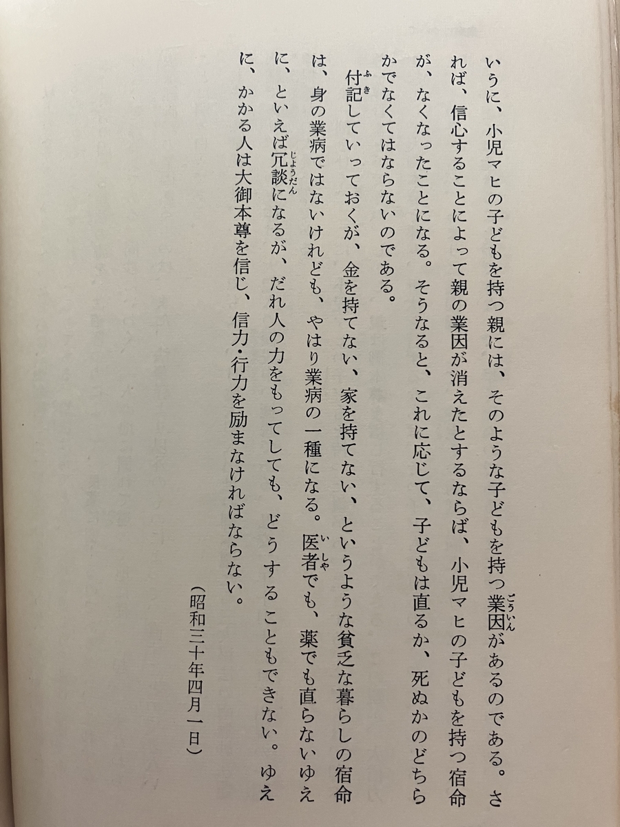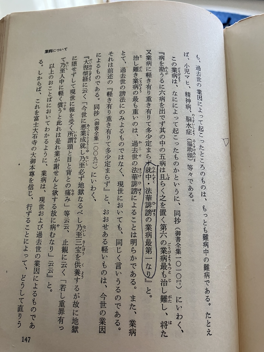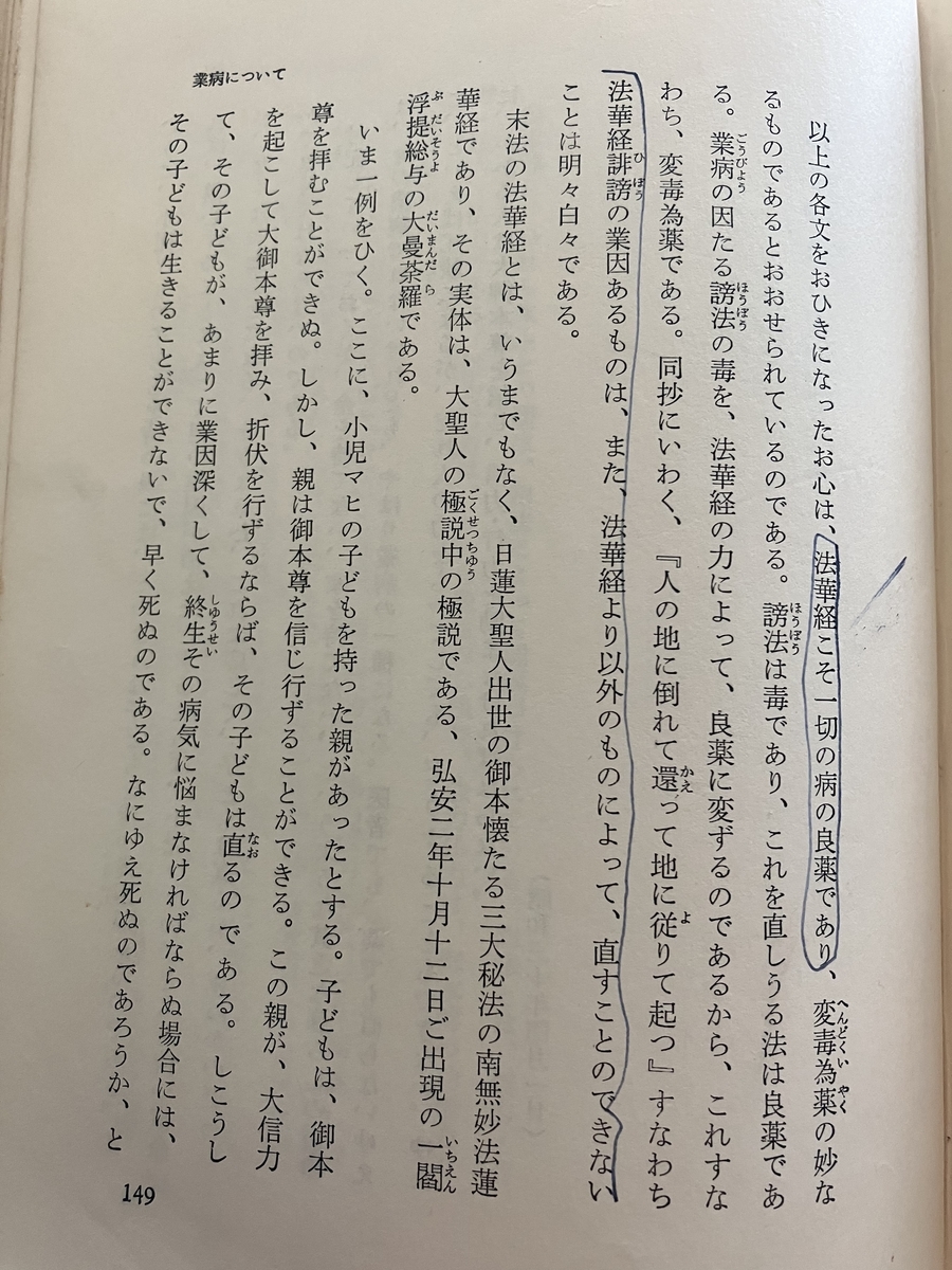 過去世の業により病気になるという指導はかつての創価学会、大石寺で広くなされていたものです。そしてそれを治すために戸田城聖氏は「大信力を起こして大御本尊を拝み、折伏を行ずるならば、その子どもは直る(ママ)」としています。