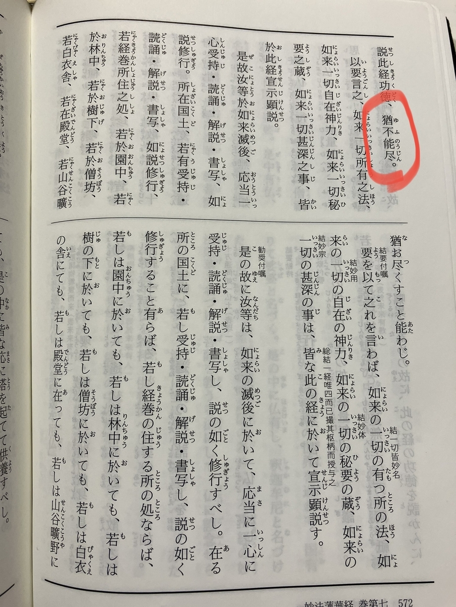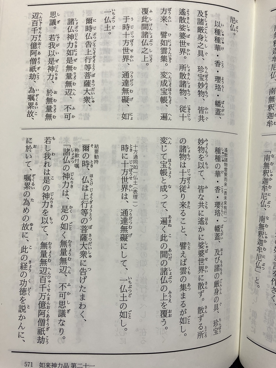 「その時、仏は上行菩薩等の大衆に告げた。『諸仏の神力はこのように無量無辺、不可思議である。もしも私がこの神力をもって、無量無辺百千万億阿僧祇の劫において、付嘱のため故にこの経の功徳を説いても、なお言い尽くすことができなかった。』」
