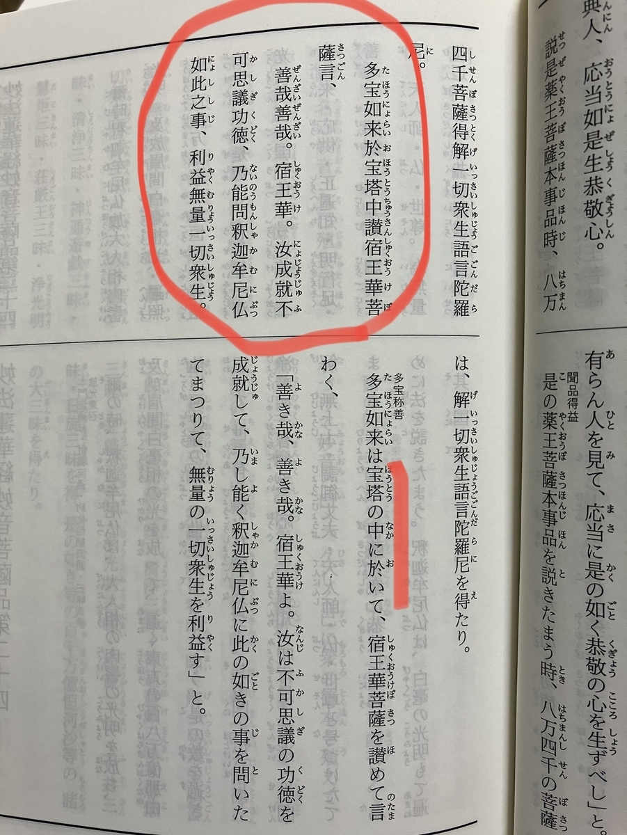 なので、本来は28章(最終章)の嘱累品が強引に「22章」として割り込まされてしまい、本来のストーリーが見えなくなってしまっているのです。天台教学では総付嘱の嘱累品第22で宝塔が閉幕し、虚空会の儀式が終わったとしますが、薬王品を読めばきちんと多宝如来が「宝塔」の中から宿王華に語りかけているのが確認できます。つまり薬王品は付嘱の儀式の最後の部分なのであり、虚空会の儀式はまだ閉幕していないのです。