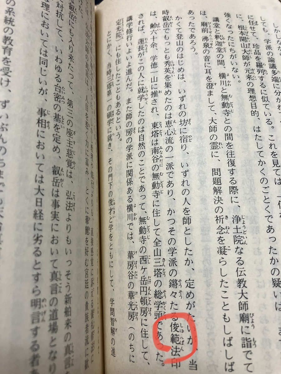 日蓮は恵心流に属する横川の俊範に師事していた説があり、姉崎正治氏も著作『法華経の行者日蓮』において、俊範に師事していた説を採っています(姉崎正治『法華経の行者日蓮』78ページ、講談社学術文庫、昭和58年【原著:昭和28年】)。