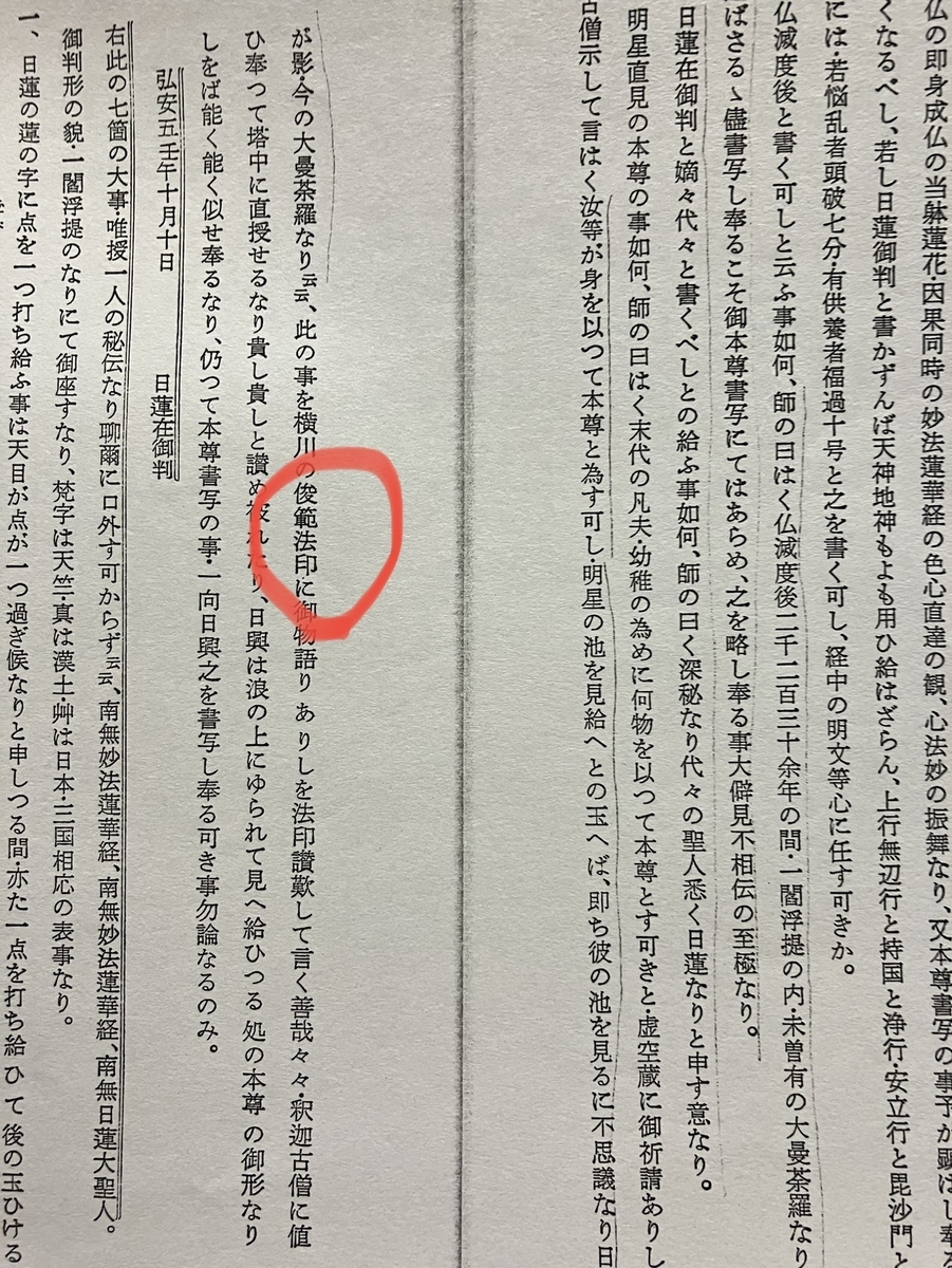 ここから考えて『百六箇抄』や『御本尊七箇相承』で俊範の権威が利用されるのは、両書がまさに偽書であるからであり、天台教学の強い富士門流の教義を権威化させる目的で、俊範と日蓮との関係性をあえて強調しているのだと思います。