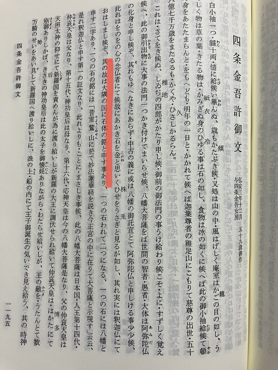 「サレハ筑紫ノ大隅国石体権現ト申ハ、是レ正八幡ニテ御座ス也。或時供僧神人引分レ、当社ノ本地ハ釈尊ト申ス、有人ハ弥陀ト申ス。有ル時両方諍論サタカナラス。而ルニ八幡ノ大庭ナル大石二分ニ破レテ、一方ニハ八幡ト云文字有之。一方ニ有銘文。昔在霊鷲山説妙法蓮華経、今在正宮中示現大菩薩文。此時ニ諸人ノ論止ヌ。本地釈尊ナレハ、昔在霊山ニシテ法華経ヲ説キ今八幡現シ給事無疑。本迹雖殊不思議一ナリ。」