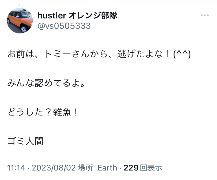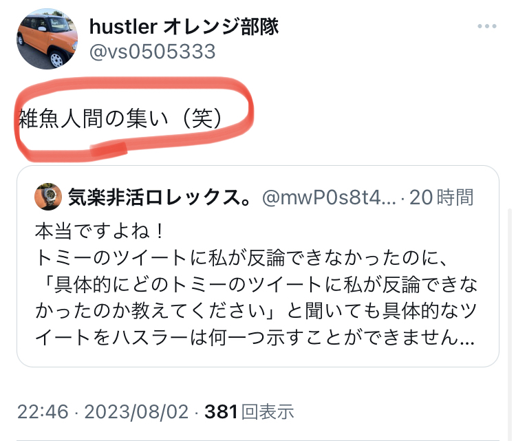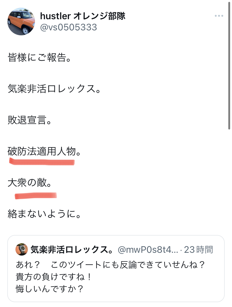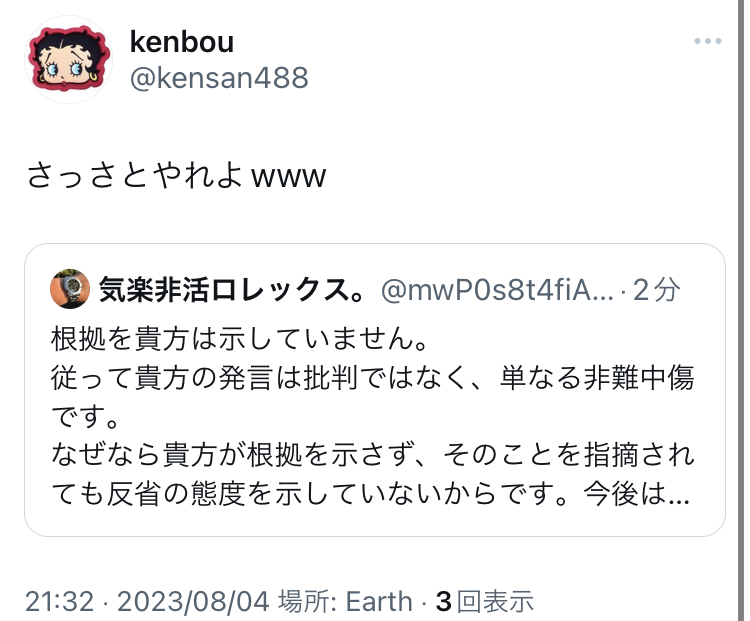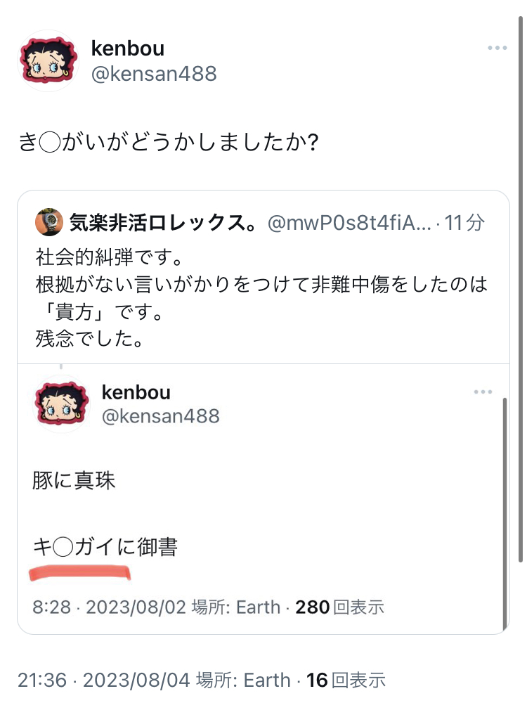 画像を見てもおわかりのように、非難中傷、侮蔑、揶揄、罵詈雑言の連続です。「ブログの内容に問題があるなら具体的な批判を」お願いしても関係のない発言を繰り返し、一方的な印象操作を図って「お前は論破された」と言い張って悪印象を与えることに終始しています。しかも見てお分かりのように、見ず知らずの他人に敬語を使うこともできず、他者を卑下して見下す態度に終始しています。