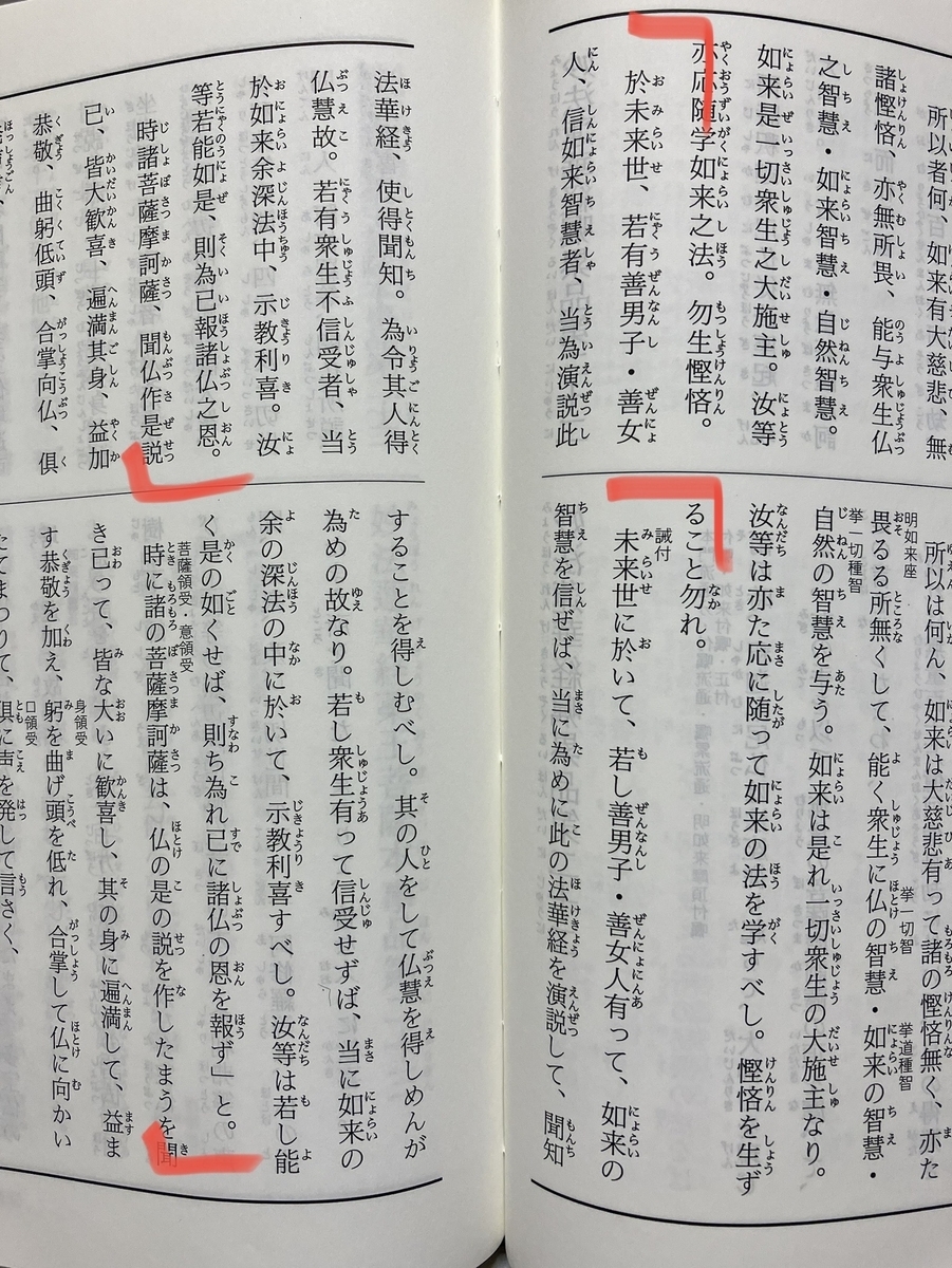 「未来世において、もし善男子・善女人たちの中に如来の智慧を信ずる者があれば、まさにこのためにこの法華経を説いて聞かせて知らせるべきである。その人をして仏の智慧を得せしめるためである。もし法華経を信受しない衆生がいたのなら、如来の法華経以外の残りの深法の中から教えを示し、利と喜びを与えるべきである。貴方たちはもしこのようにするならば、すなわち既に諸仏の恩を報ずることになる」