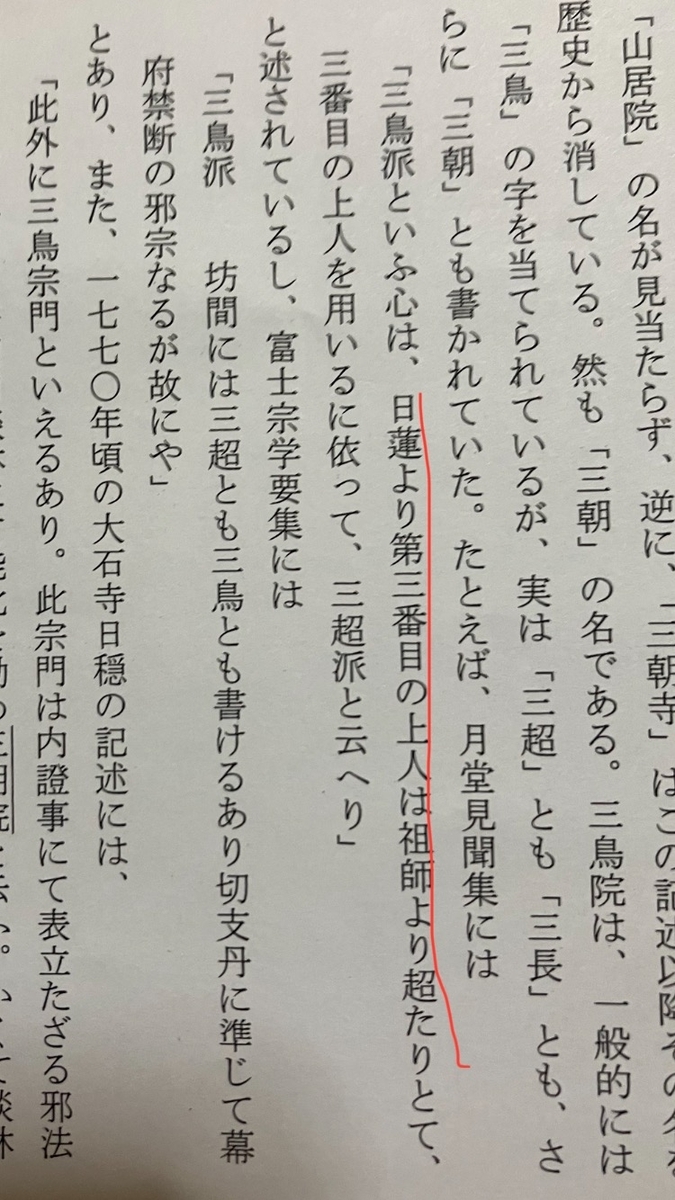 前回の記事(2024.11.30)で引用した沼津市明治史料館編『愛鷹山中の謎の遺跡 山居院 -史実が伝説になるとき-』(沼津市明治史料館、2000年)にもあるのですが、この中で引用された『月堂見聞集』には「三鳥派といふ心は、日蓮より第三番目の上人は祖師より超たりとて、三番目の上人を用いるに依って、三鳥派と云へり」(同23ページ)とあるように、日蓮・日興と並び大石寺3祖の日目を尊崇するという教義です。