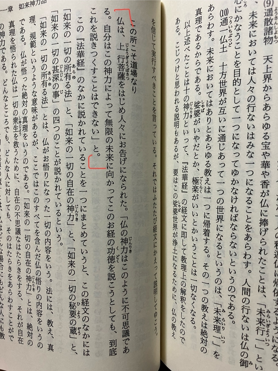 まず如来神力品です。明確にここには「仏は、上行菩薩をはじめとする人々にお告げになられた。「仏の神力はこのように不可思議である。自分はこの神力によって無限の未来に向かってこのお経の功徳を説こうとしても、到底これを説き尽くすことはできない。」と書かれています(同333ページ)。