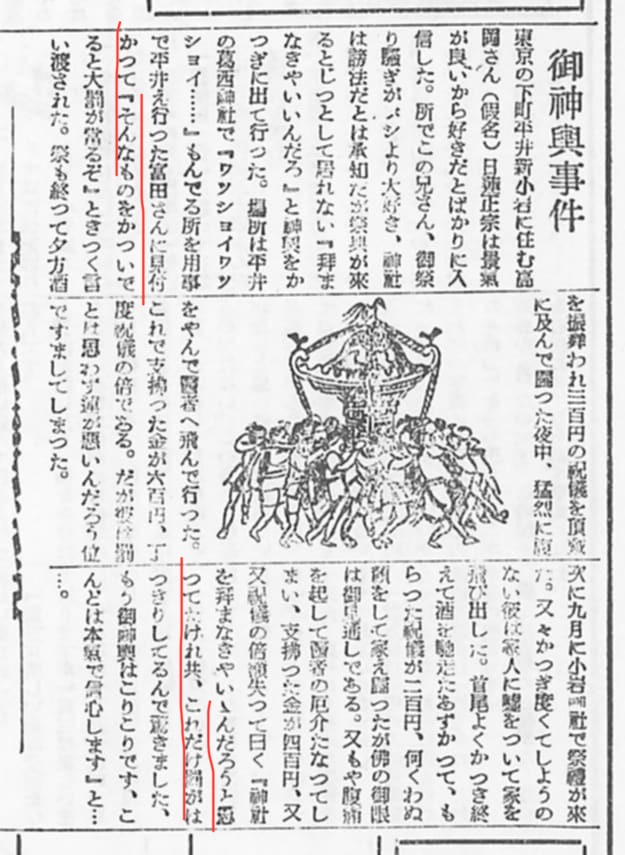次に九月に小岩神社で祭礼が来た。又々かつぎ渡くてしようのない彼は家人に嘘をついて家を飛び出した。首尾よくかつぎ終えて酒を馳走にあずかって、もらった祝儀が二百円、何くわぬ顔をして家へ帰ったが仏の御眼は御見通しである。又もや腹痛を起して医者の厄介になってしまい、支払った金が四百円、又又祝儀の倍額失って曰く「神社を拝まなきゃいゝんだろうと思っていたけれ共、これだけ罰がはっきりしてるんで驚きました。もう御神輿はこりごりです。こんどは本気で信心します」と……。」