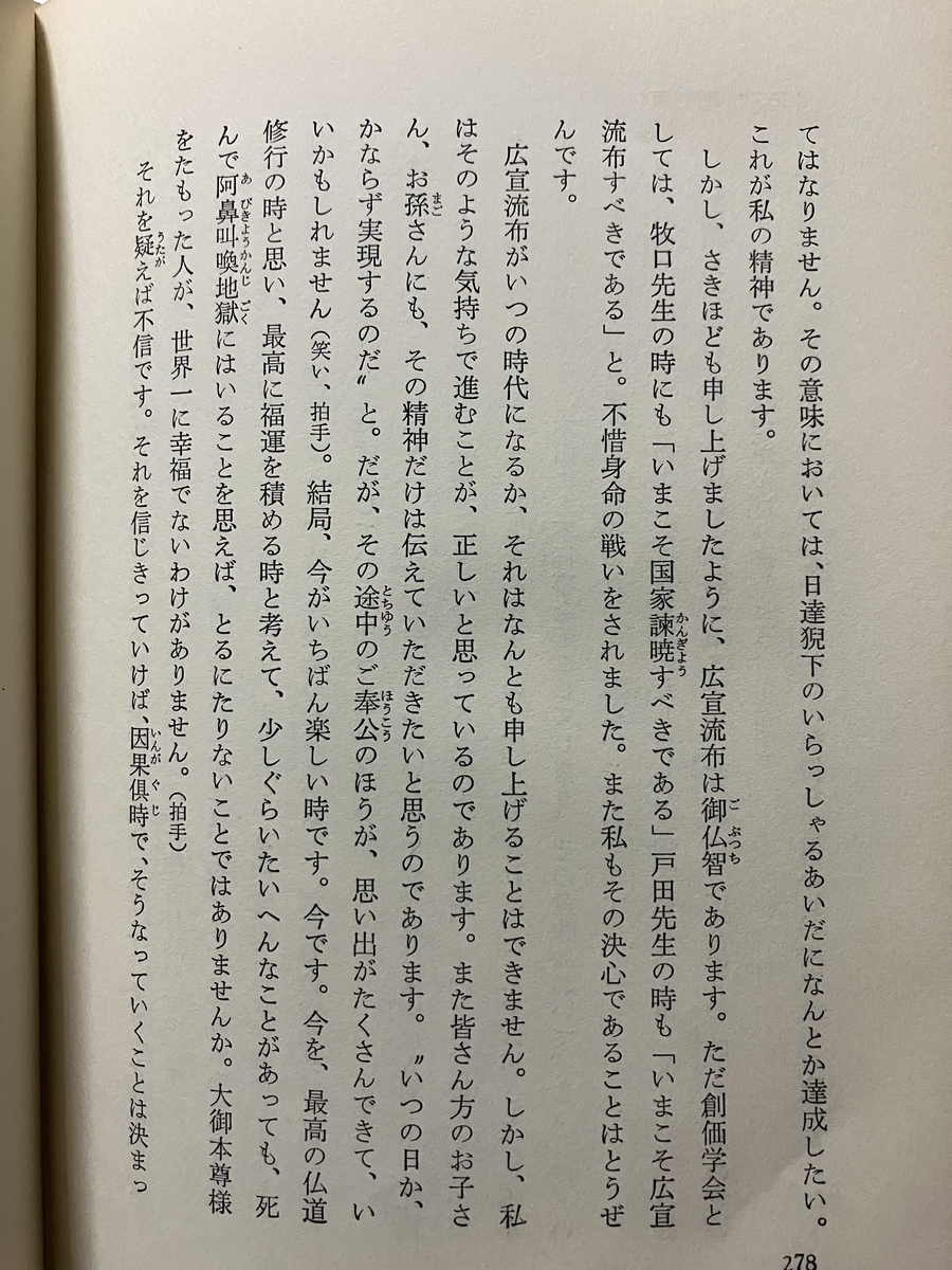 「どんなに公明党が発展しようが、広宣流布は御仏智であります。そしてまた猊下のご一念であられるのです。広宣流布の時には、不開門(あかずのもん)が開きます。その時は、どういう儀式になるか。それは私ども凡下には測り知ることはできません。広宣流布の時は、国が最高に繁栄している時であり、一国のためにも、国民のためにも未曾有の幸福の時です。そうした背景のもとに広宣流布の儀式が行なわれるのです。それが創価学会の究極の目的の一つです。