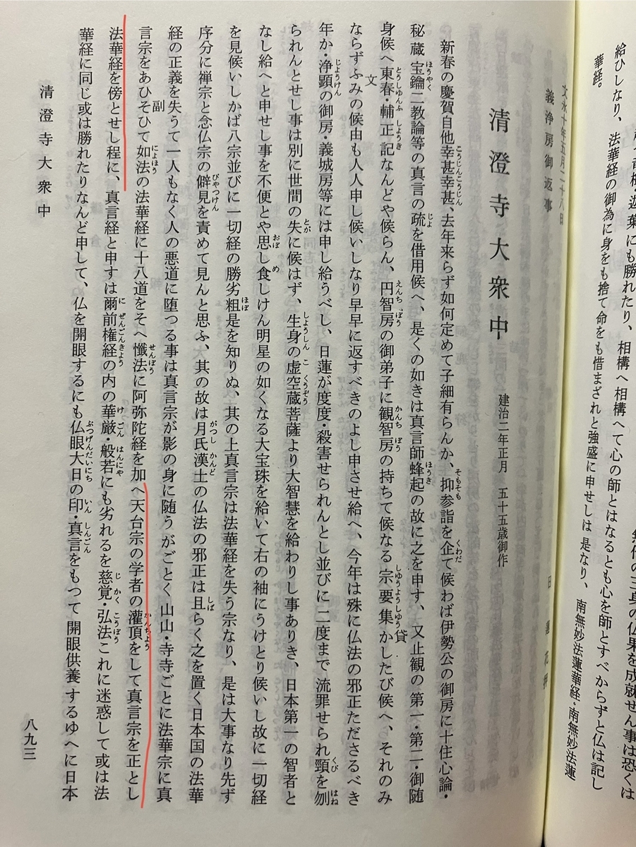加えて日蓮は「天台宗が真言の灌頂を取り入れて法華経を傍とすること」を『清澄寺大衆中』(真蹟身延曽存)で明確に「天台宗の学者の灌頂をして真言宗を正とし法華経を傍とせし程に」(同893ページ)と述べて批判しているのです。真蹟中で「灌頂」を批判した日蓮が、「灌頂」の儀式を弟子に行うなど論理的にあり得ません。