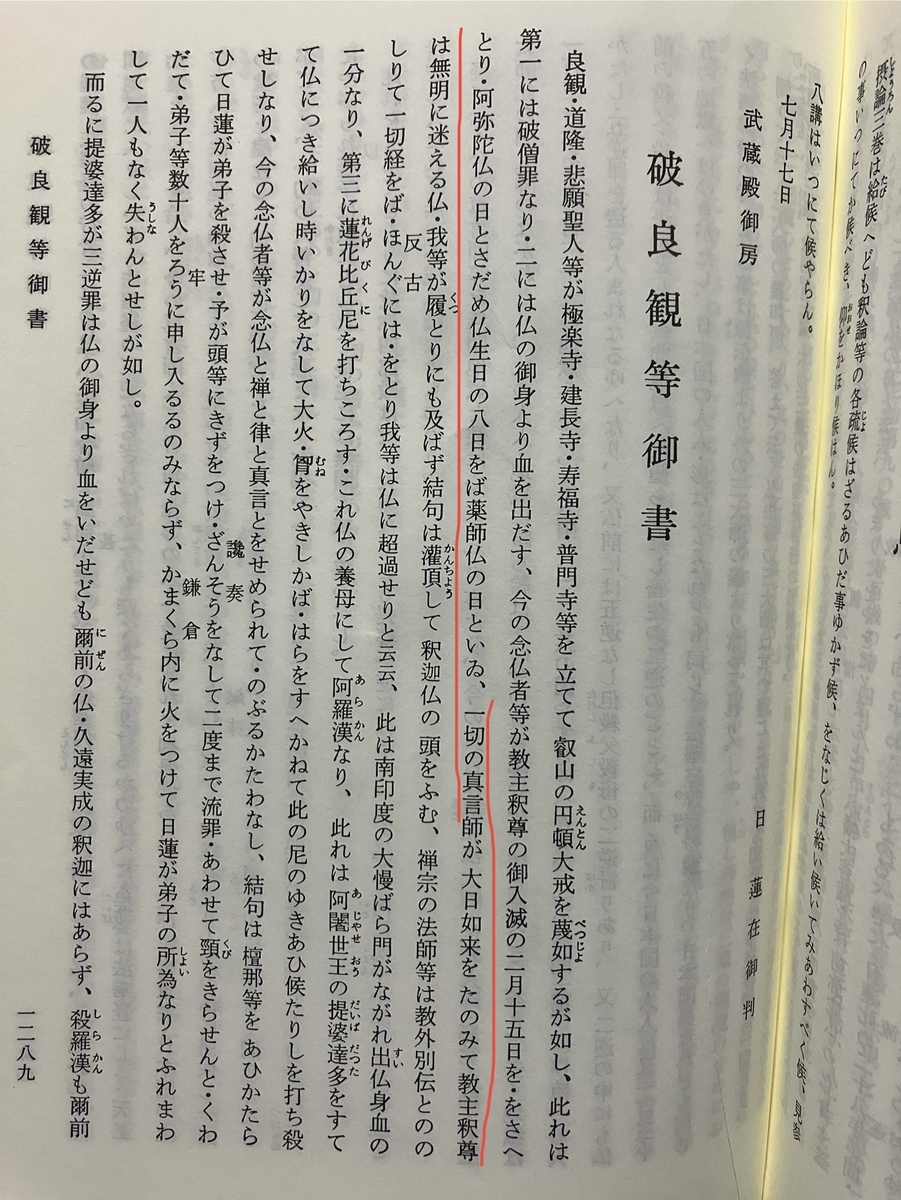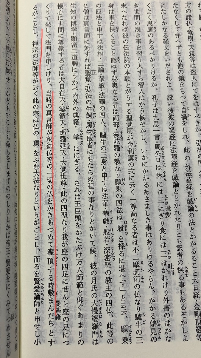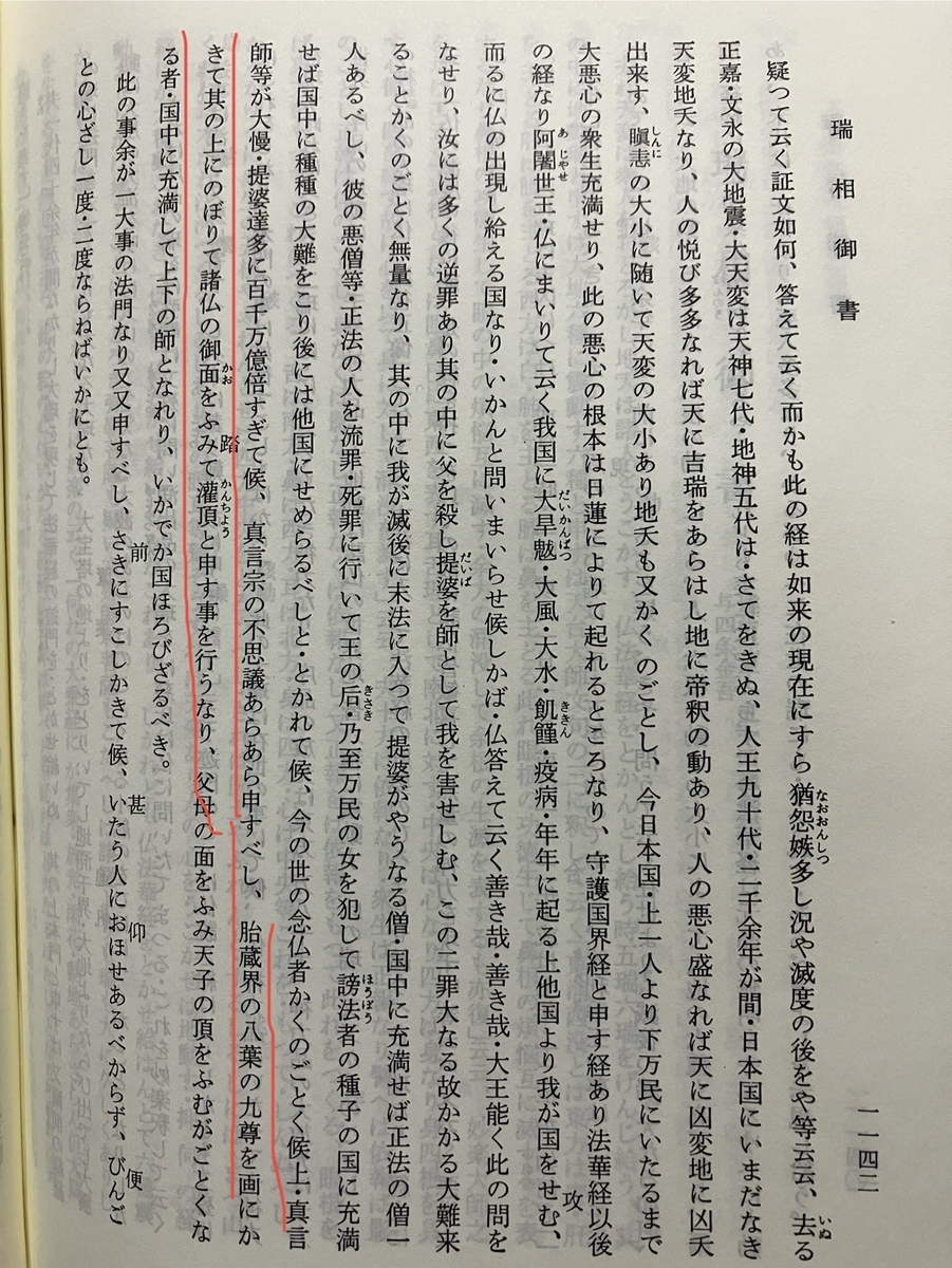 例えば『撰時抄』(真蹟玉沢妙法華寺他現存)には「当時の真言師が釈迦仏等の一切の仏をかきあつめて灌頂する時敷まんだらとするがごとし、禅宗の法師等が云く此の宗は仏の頂をふむ大法なりというがごとし」(同278ページ)とありますし、『瑞相御書』(身延曽存)には「胎蔵界の八葉の九尊を画にかきて其の上にのぼりて諸仏の御面をふみて灌頂と申すことを行うなり、父母の面をふみ天子の頂をふむがごとくなる者・国中に充満して上下の師となれり、いかでか国ほろびざるべき」(同1142ページ)とまで書いてあります。しかも『破良観等御書』(身延曽存)では「一切の真言師が大日如来をたのみて教主釈尊は無明に迷える仏・我等が履とりにも及ばず結句は灌頂して釈迦仏の頭をふむ」(同1289ページ)と書かれています。