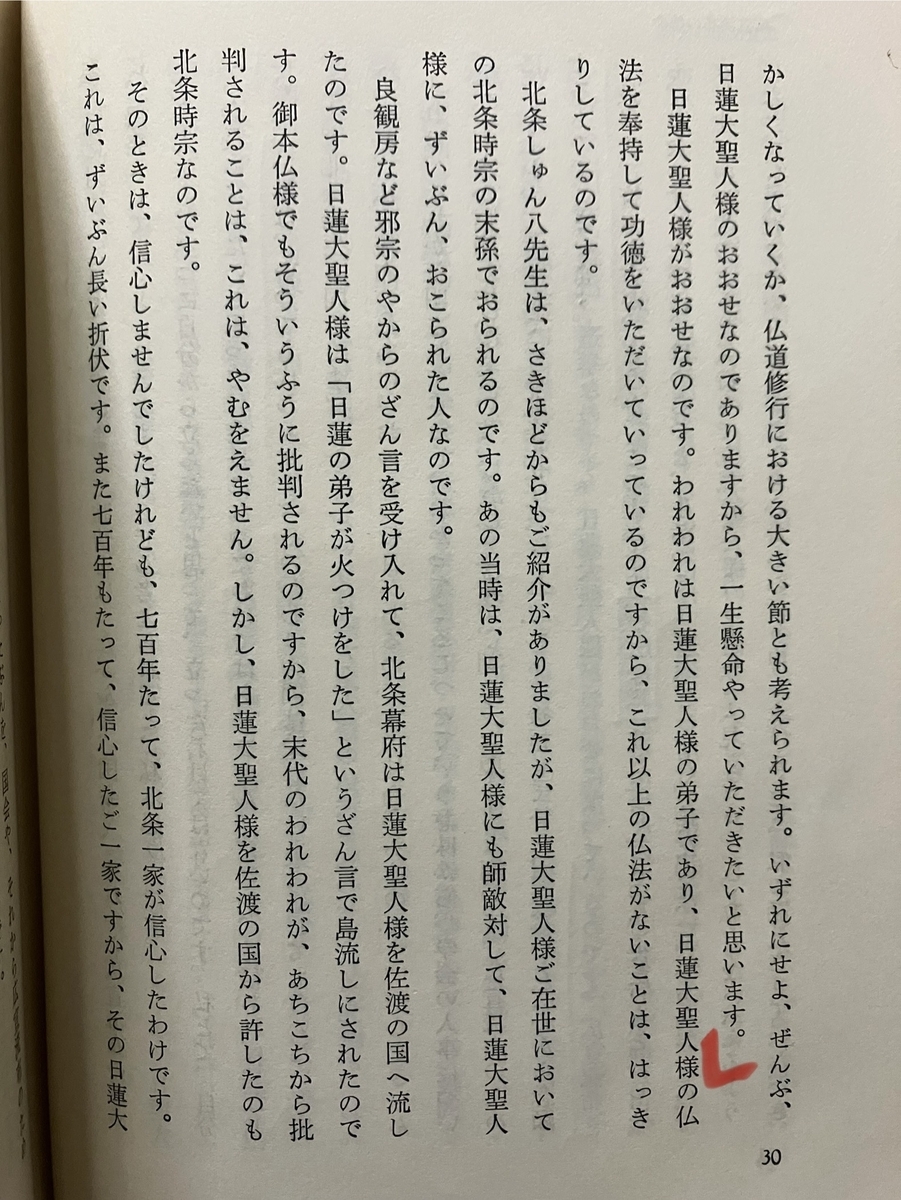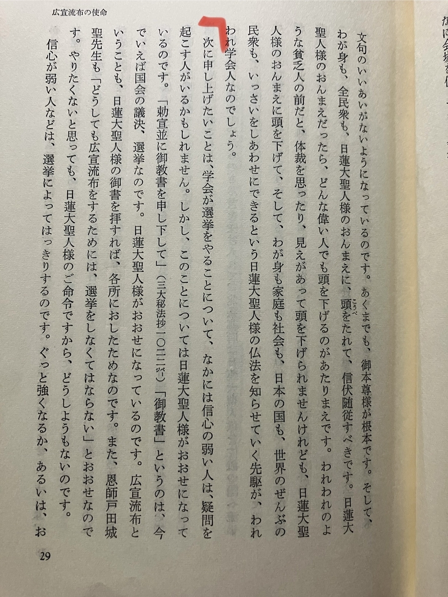 「次に申し上げたいことは、学会が選挙をやることについて、なかには信心の弱い人は、疑問を起こす人がいるかもしれません。しかし、このことについては日蓮大聖人様がおおせになっているのです。「勅宣並に御教書を申し下して」(三大秘法抄1022ページ)「御教書」というのは、今でいえば国会の議決、選挙なのです。日蓮大聖人様がおおせになっているのです。広宣流布ということも、日蓮大聖人様の御書を拝すれば、各所におしたためなのです。また、戸田城聖先生も「どうしても広宣流布をするためには、選挙をしなくてはならない」とおおせなのです。やりたくないと思っても、日蓮大聖人様のご命令ですから、どうしようもないのです。