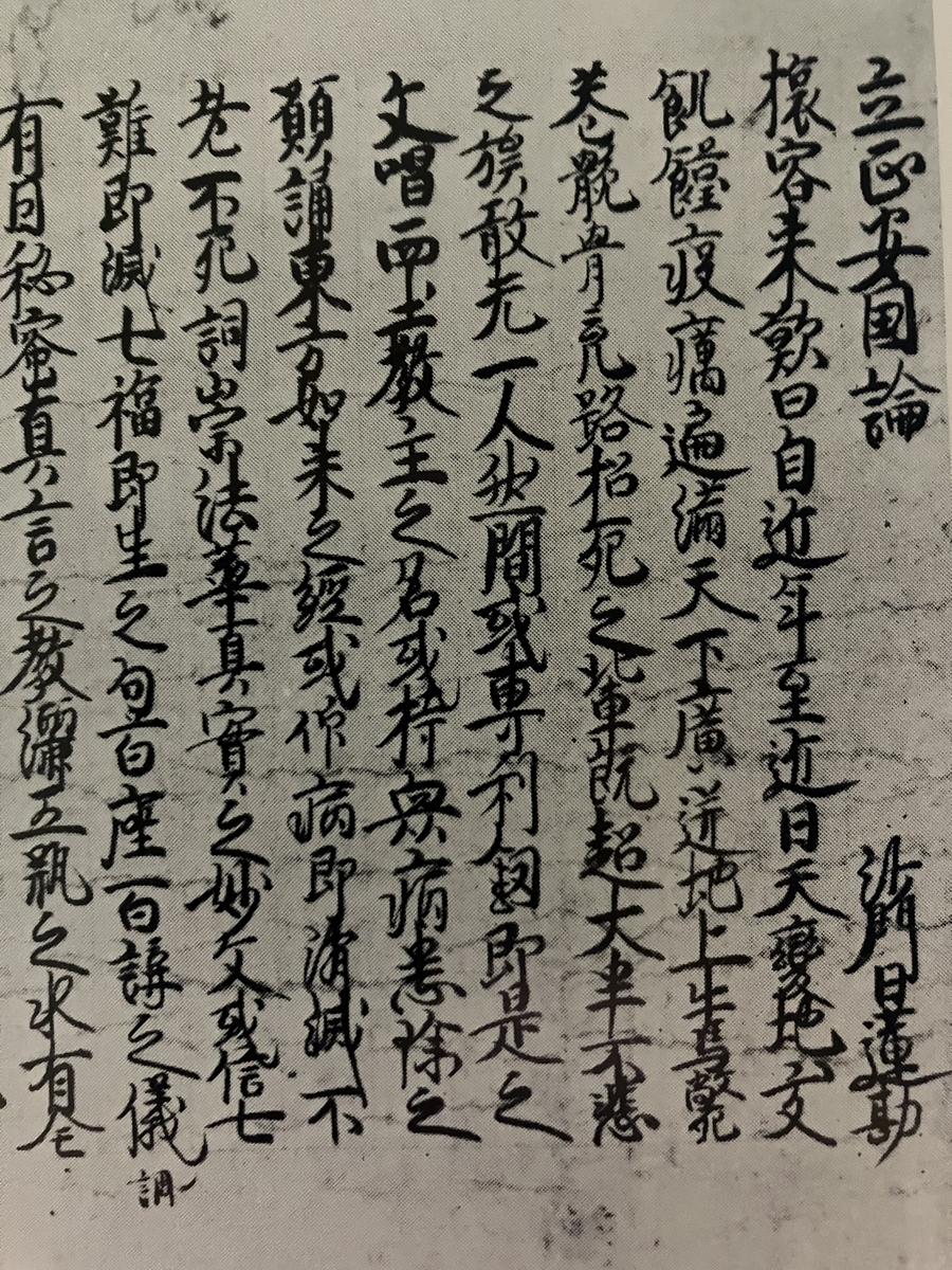 『立正安国論』は文応元年(1260年)に書かれ、北条時頼に上呈されたものですが、実は日蓮は後年、これを建治から弘安頃にかけて引用経典を増補するのみならず、浄土宗批判だけでなく、特に真言宗批判を強く打ち出した『広本』を書きます。これは「建治の広本」として知られ、多くの遺文集で文応元年の『立正安国論』とは別にこの『広本』を併せて収録しています。そのため、ほとんどの創価学会信徒は『立正安国論』に文応元年の『略本』と建治の『広本』が存在することさえ知りません。